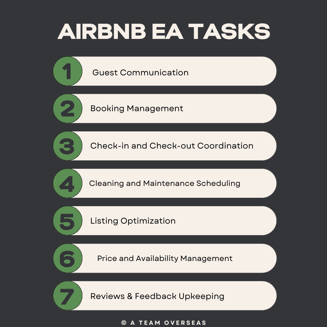 According to a survey by Hostfully, 67% of Airbnb hosts believe that outsourcing tasks like guest communication and property management improves their hosting experience. This shows just how relevant the role of an Airbnb EA (remote executive assistant) can be if leveraged correctly. A virtual assistant for Airbnb hosts takes on various tasks to streamline operations and enhance guest experiences. These tasks can include managing guest inquiries, handling booking requests, coordinating check-ins and check-outs, scheduling cleaning services, and maintaining listings. They can also assist with marketing efforts, such as optimizing listings for search visibility and managing social media accounts.
